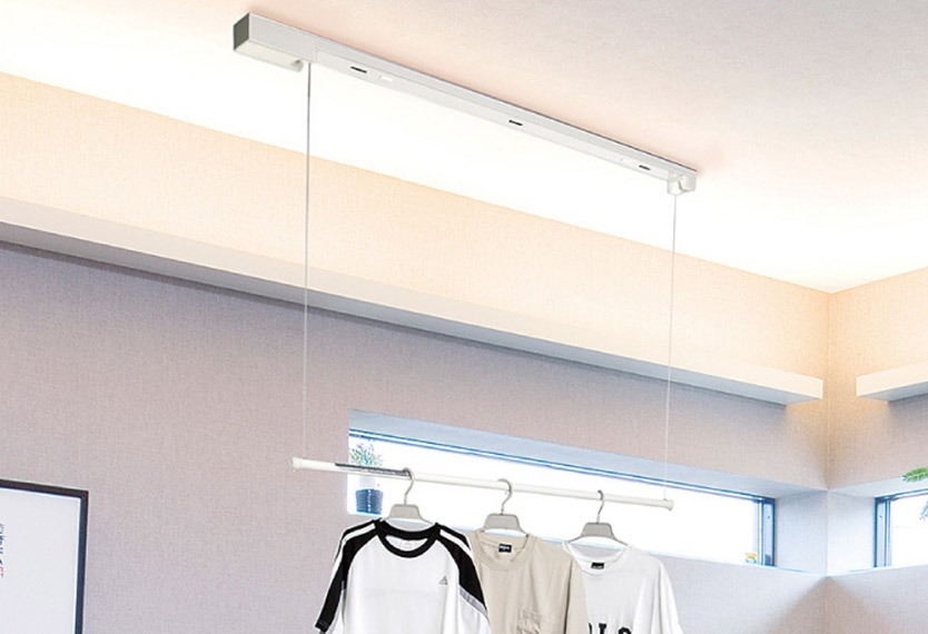 洗濯物を干すたびに3階のベランダに行くのは面倒だと感じたため、日當たりのいい洗面臺に洗濯物が干せるよう室內物干を設置。外出中に急な雨がふっても問題ない。