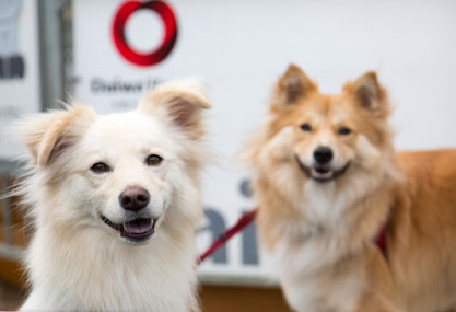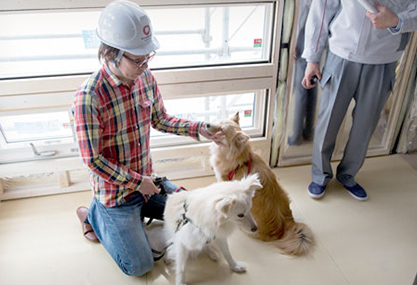 現(xiàn)場での階段上り下りは危ないので、犬を抱えて移動する