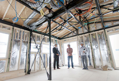 案內(nèi)してくれたのは、間宮さんに加え、コンストラクターの中間三甲男さん。このときの家は基礎(chǔ)と骨組まではできているが、內(nèi)裝などはまだこれからという狀態(tài)。そのため斷熱材や配線が向きだしになっているが、これらは完成すると見えなくなるところなので今のうちにじっくり見學(xué)させてもらった。