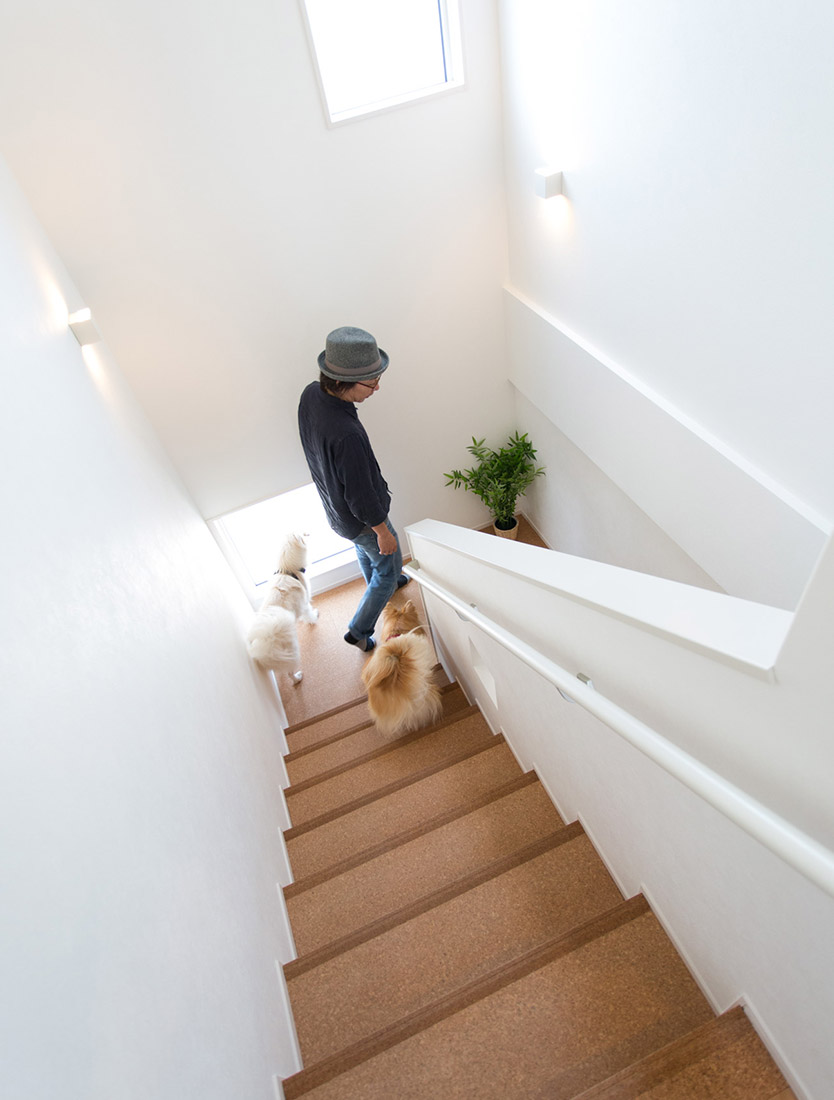 完成した家を見てもらったとおり、リビングの床をコルク材に、その他の床をシリコンコーティングに、水飲み場の設(shè)置、タイル張りの犬用スペース、そして傾斜の緩やかな階段などなど、今回の家には犬のために様々な配慮を施した。特にこの建坪の3階建てで緩勾配の階段は、かなりこだわった仕様になっていると思う。