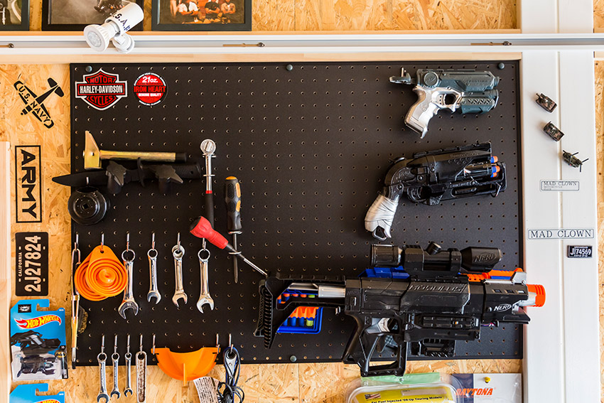 十分な面積の確保が難しければ、できるだけ高さをとる工夫をしましょう。面積が狹くても高さを有効に使えれば小物類を天井から吊り下げることができますし、サーフィンなどを楽しむ方は、上部の空間をうまく使ってボードを収納することも可能です