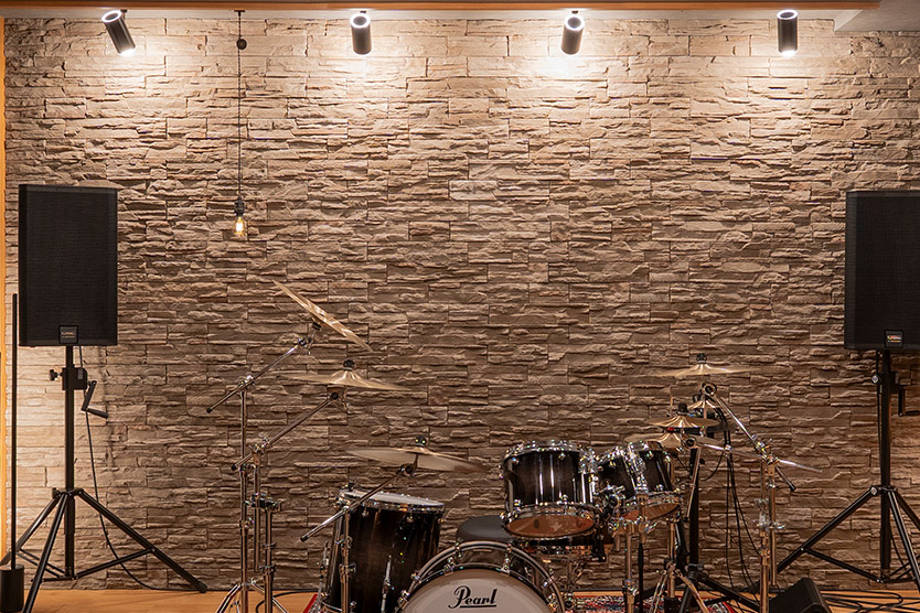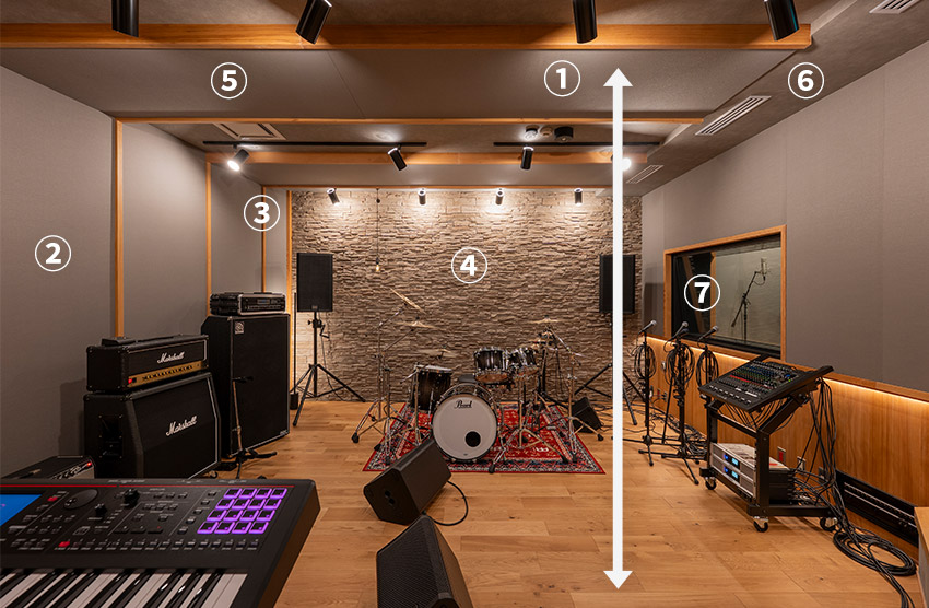 生の音に近いクリアな音を録るために、音の反射と吸音のバランスを細(xì)かく調(diào)整。ドラム背面の荒々しい石壁④は、音を拡散しつつ、音のパワーを前に押し出す効果があります。撮影や配信でも映える內(nèi)裝です。