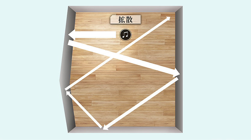 そこで、1辺の壁②を斜め(「く」の字型)にして、音の反射方向を分散させ、音が拡散しながら減衰するようにしました。
