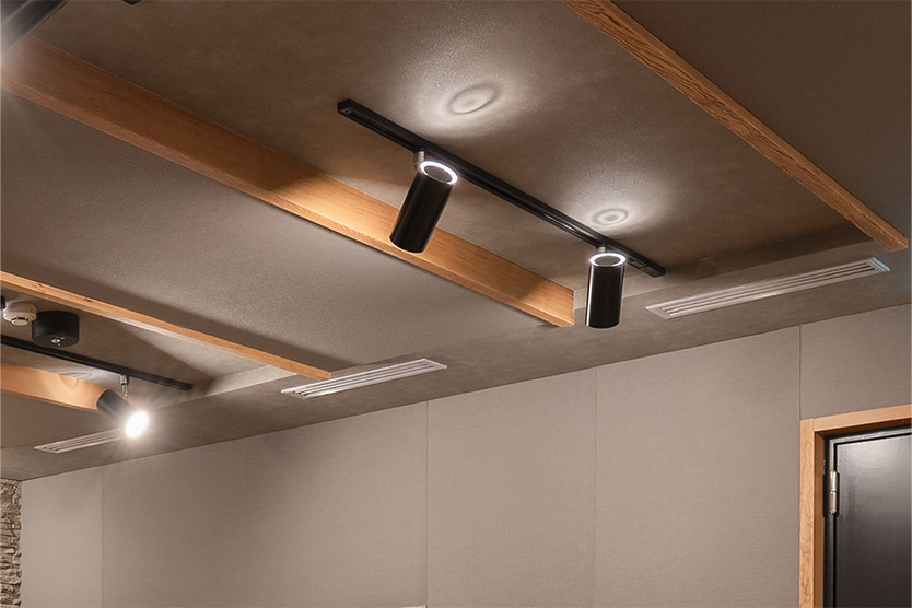 Kさま邸のベースにした「xevoΣ(ジーヴォシグマ)」は、もともとの天井高が2m72cm※ありますが、1階スタジオスペースはさらに大和ハウスが誇る「ロースタイルリビング」方式で床を掘り下げて2m83cm①に。天井に取り付けた空調(diào)機(jī)器の出っ張りまでミリ単位で調(diào)整し、可能な限りの高さを確保しました。