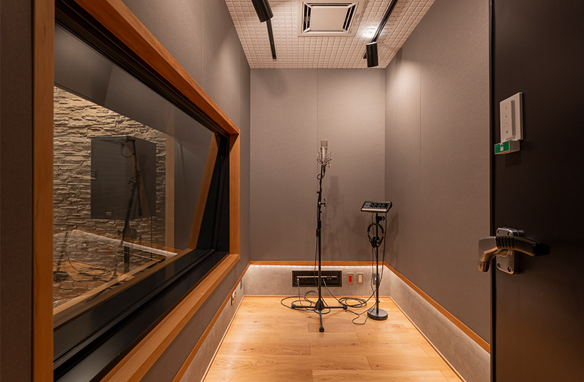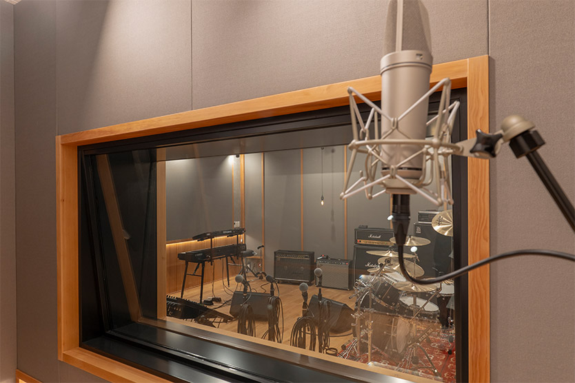 ボーカル以外にも、アコースティックギターやホーンセクション、バックコーラス隊(duì)が入れるように、少し広めのスペースを確保。また、窓ガラスは音の拡散を狙い、斜めに設(shè)置しています。