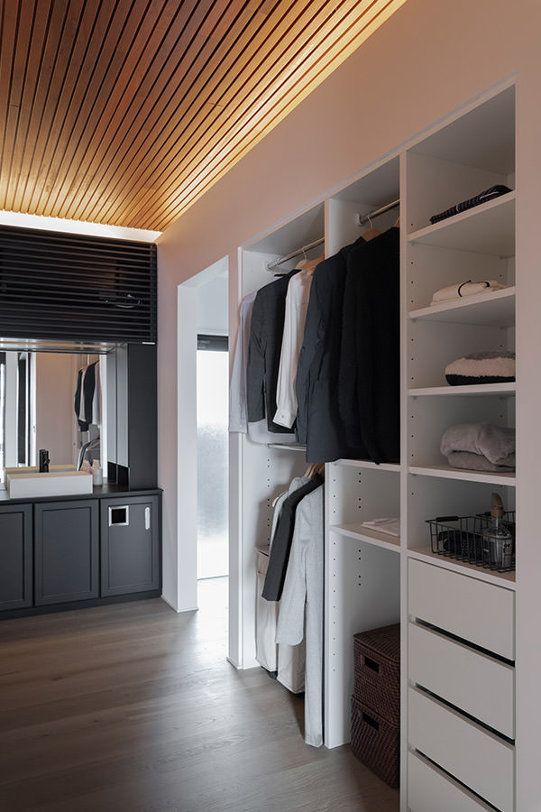 「飾り棚の裏側の収納動線にもご注目ください。手洗い臺のあるドレッサースペースを設け、その先にウォークインクローゼットを配置していますから、朝の身支度やメイクもスムーズです」