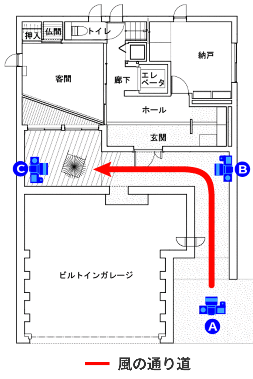 「外に閉じ?中に開く」家中庭につながる「風の回廊」。