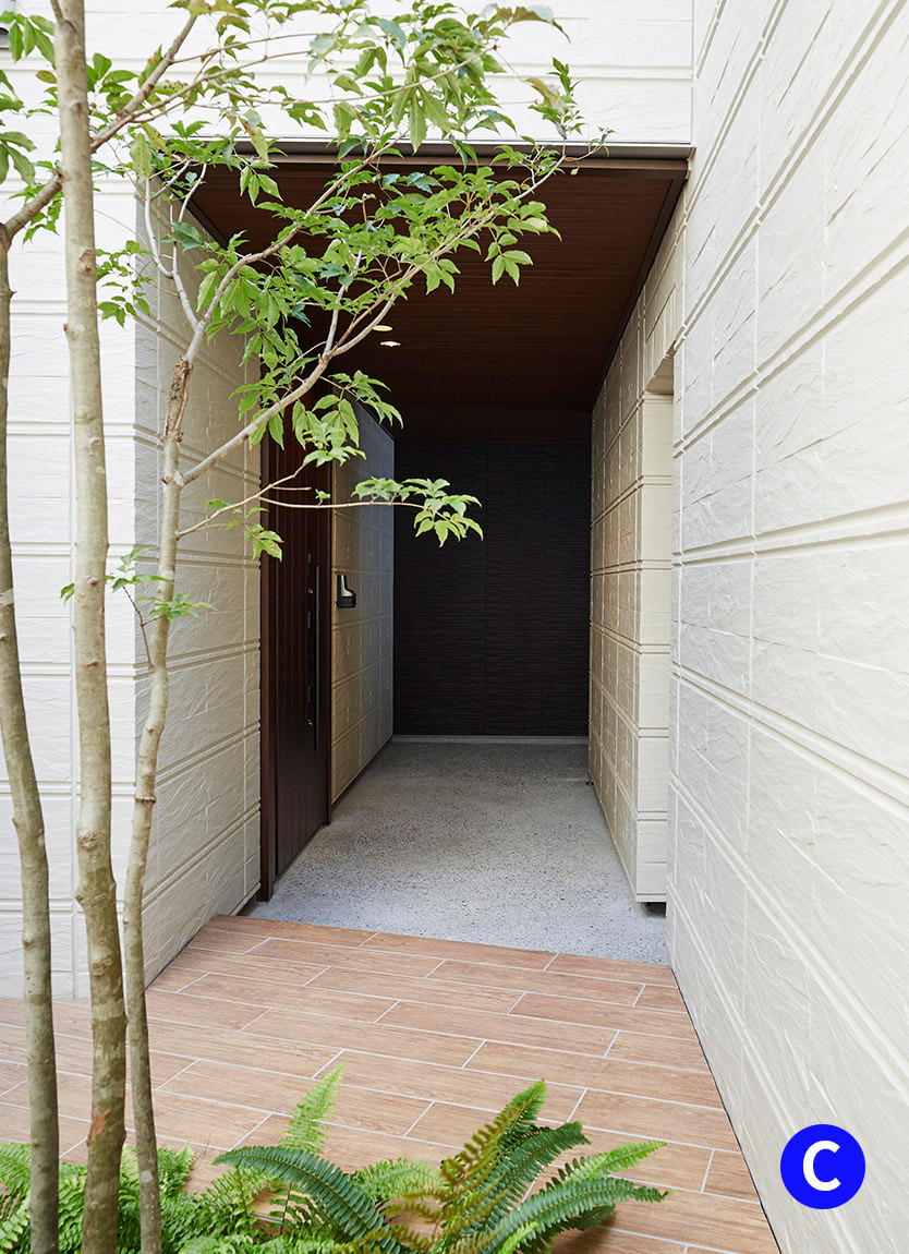 ご夫妻が希望されたプライバシーを守るために窓の少ないシンプルな外観デザイン。門扉から始まる路地のような通路から風を取り込み、明るい中庭まで風が通るレイアウトは、ご夫妻が「風の回廊」と名付けたお気に入りの場所です。閉鎖的な外の印象と、中に入って感じる心地よい開放感は、別の建物と思うほど対照的で、「外に閉じ?中に開く」のコンセプトが形になっています。