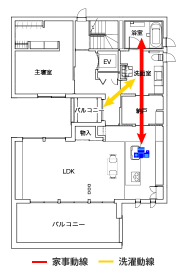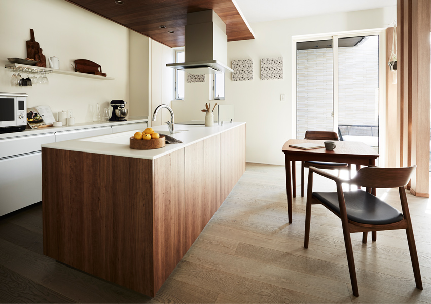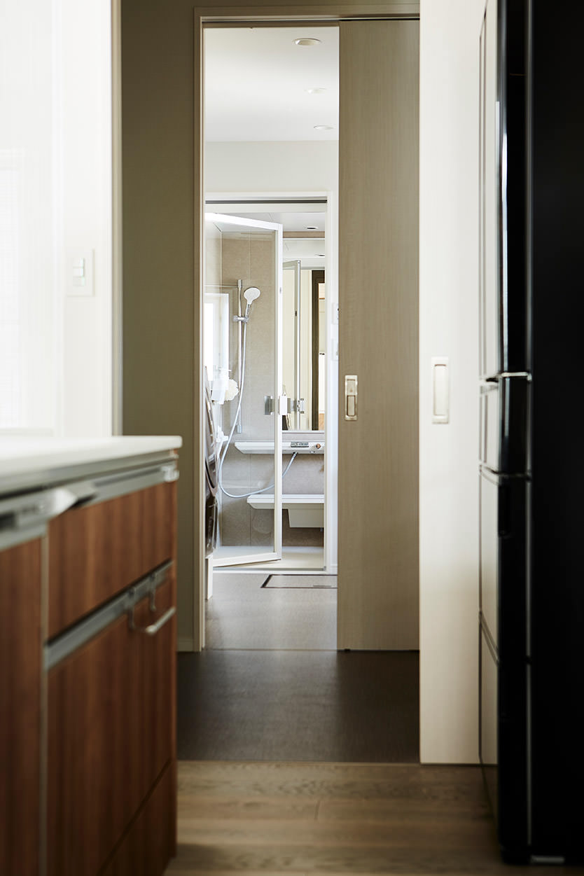 キッチンからパントリー、洗面室、浴室までを一直線に並べた動線は、「掃除やゴミを集めるときにとても便利」とご夫妻に喜ばれています。各部屋をつなぐスライドドアは開けたままでもデッドスペースができず、スッキリとした印象。さらに、洗濯物を干す専用のベランダは、洗濯機がある洗面室の斜め前にレイアウトされています。洗練された動線は家事の効率を上げ、ご夫妻にゆとりの時間を生みました。