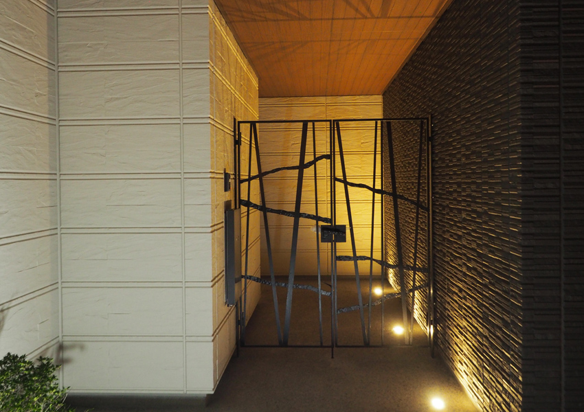 日が暮れると、下から上を照らすアッパーライトが建物の美しい素材感や立體感を引き立て、奧へと誘います。