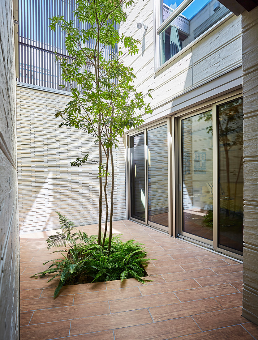 1階中庭にあるアオダモは、2階リビングの窓からも眺められ、鳥のような目線で日々変化する植物の成長が楽しめます。
