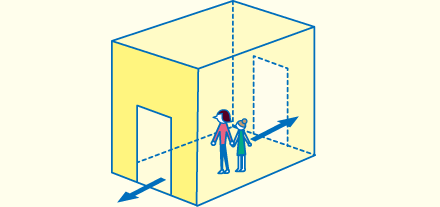 避難の際、玄関などの出口まで最短距離で動けるように、動きをさまたげる場所に家具を配置しないことが大切。また、置き家具を使う場合は専用の固定器具で壁に固定します。一戸建てや集合住宅の低層階なら、家具と床の間に挾み込むジェルタイプのマットなどで固定することもできます。