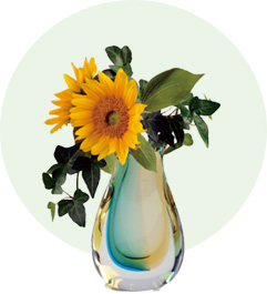 ヒマワリ、アイビー透明な器を使う時は、莖を短めにしたり、ビー玉などを入れたりと、器の中もきれいに見える工夫をしてみましょう。