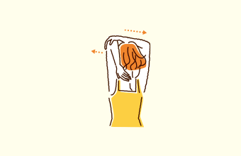 - 1ひじを曲げて左腕を上げ、右手でひじをつかんで両腕を広げるように両手を引き合います。