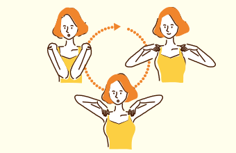 指先で両肩を觸り、ひじを回します。始めは小さく、だんだんと大きく回しましょう。前後とも行ってください。