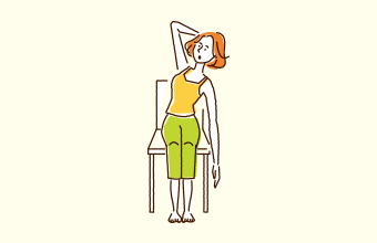 - 1椅子に座り、背筋を伸ばして右手を頭の後ろにつけます。息を吐いてからゆっくり吸い、ひじを天井に向け、左わき腹を縮めて右わき腹を伸ばします。この時、目線を右ひじに向け、ひじを少し後ろに引くとさらに胸郭が広がります。