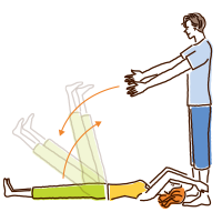 トレーニングをする人は、頭をパートナーの方に向けて仰向けになり、両手でパートナーの足首をつかみます。両足をそろえて持ち上げて、足先をパートナーに近づけます。