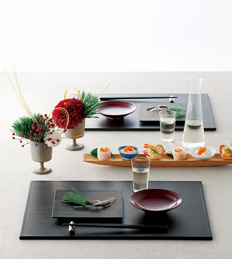 新春の集まりやお祝いごとなど晴れの日のテーブルは華やかに、そして少しあらたまった雰囲気でおもてなしの気持ちを伝えます。漆の折敷(おしき)に取り皿などをセットすると端正な印象に。朱塗りの漆器やシルバーの箸置きはアクセントとなり、特別感を演出します。新春の集いのテーブルには正月らしい花を飾り、そして皿にも水引を結んだ松葉を添えるといっそう晴れやかに。まずは、乾杯のお酒と前菜を用意して、晴れの宴のスタートです。