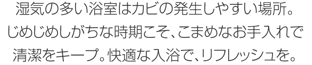 濕気の多い浴室はカビの発生しやすい場所。じめじめしがちな時期こそ、こまめなお手入れで清潔をキープ??爝mな入浴で、リフレッシュを。