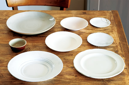 和食器も無地の明るいトーンなら、洋食器とも相性がよく、どんな料理とも合わせやすい。また、気に入った器は割れても、金継ぎをして大切に使っています。