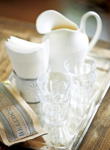 スペインの田舎町をイメージしてコーディネート。テーブルにはクロスを掛けずに木のぬくもりを生かし、料理は木のトレイやボードに盛りつけます。お皿にはユーカリを一枝添えて爽やかに。ライラックなど初夏の花は素樸な陶器のピッチャーに生けます。