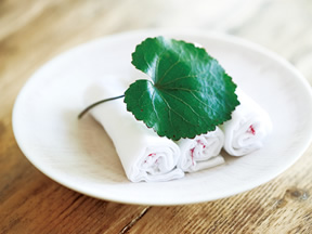 トレイ代わりにお皿におしぼりを。葉っぱを添えて、さりげなくおもてなしの気持ちを伝えます。