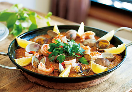 まずは、サングリアで乾杯!前菜をつまみながらワイワイと、おしゃべりを楽しみます。場がなごんできたら、メインディッシュのパエリアの登場です。「出來たてを鍋ごとテーブルへ出すと、見た目も豪華。サーブ役もゲストにお任せすれば、さらに盛り上がりますよ」。パエリアはある程度仕込んでおいて、タイミングを見計らって仕上げます。また、取り皿は前菜用とメイン用に2枚重ねてセットしておけばスムーズです。「なるべくキッチンに立つ時間を減らすよう、事前に準備できるメニューを考えます。ゲストに気を使わせないのはもちろん、ホストもみんなと一緒に楽しみたいですものね」