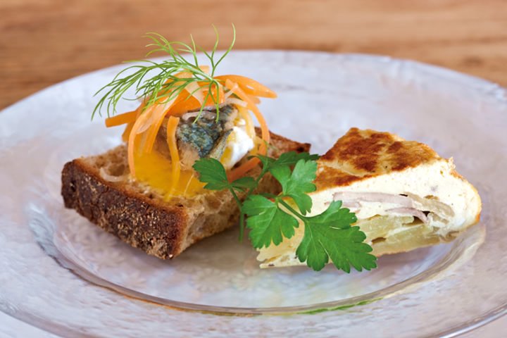 いわしにカレー粉をまぶして揚げ、野菜と一緒に甘酢に漬け込んだ南蠻漬け。パーティーのオードブルとして食べやすいようパンにのせてカナッペに(寫真左)。