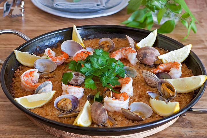 - (8)全體にとろみがついてきたら弱火にし、(5)とあさりをのせ、アルミホイルをしっかりかぶせ、パチパチと音がするまで15分ほど煮る。一度お米を食べてみて芯がなければ、さらに弱火にして3分ほど煮て、お米に焦げ目をつける。火を止めて5分ほど蒸らし、アルミホイルを外して、レモンとイタリアンパセリを飾る。