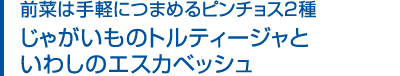 テーブルの中央に並べた前菜2皿。いずれも取り分けやすくカットしてあるので、各自で取り皿へ。じゃがいものトルティージャ(下寫真右)といわしのエスカベッシュ(下寫真左)