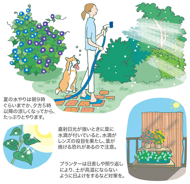 夏の暑い日中、土の溫度が高くなっているときに水を與えると蒸れて根を傷めてしまいます。水やりは土が乾いているか確認し、朝か夕方の涼しい時間帯になってから、1日1回たっぷりと與えましょう。夕方になる前に鉢植えの植物が水切れを起こしてぐったりしているときは、日陰の涼しいところに移動してから水をやります。鉢ごとバケツにくんだ水に浸けて冷やし、吸水させてやるのもよいでしょう。
