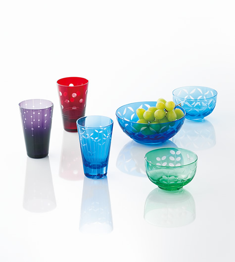 切子作家?吉田順子さんのガラス器は、江戸切子の高度な伝統技術を生かしながら描く、シンプルな幾何學模様や草花をモチーフにした溫かみのあるデザインが特徴。右から、小鉢(かざぐるま/青)、淺鉢(かざぐるま/青)、小鉢(小鳥と蝶/緑)、Vタンブラー(ふた葉/青)、(水玉と2本線/赤)、(つながる小玉/紫)