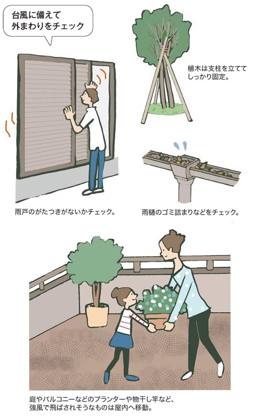 臺風では、強風により飛んできた木片や瓦の破片などによって外壁や屋根、窓ガラスが破損するなどの被害を受けるおそれがあります。庭やバルコニーなど屋外は強風で物が散亂しないよう片付けるかしっかり固定。植木には支柱を立てておきましょう。また、排水口は掃除をして、水はけをよくしておきましょう。