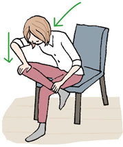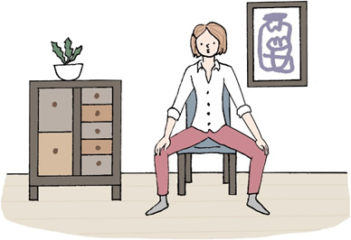 椅子に淺めに腰掛け、両足を膝とつま先が同じ方向を向くように、大きく開く。