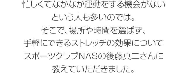 最近は暮らしが楽になり、日常生活では體の最大能力の2~3割しか使っていないといわれます。體は意識して動かさないと衰えていきます。また、急に動いてけがなどしないよう、自分の體がどこまで動くかを知っておくことも必要です。ストレッチで1日に1度は自分の體に意識を向ける時間を持ちましょう。