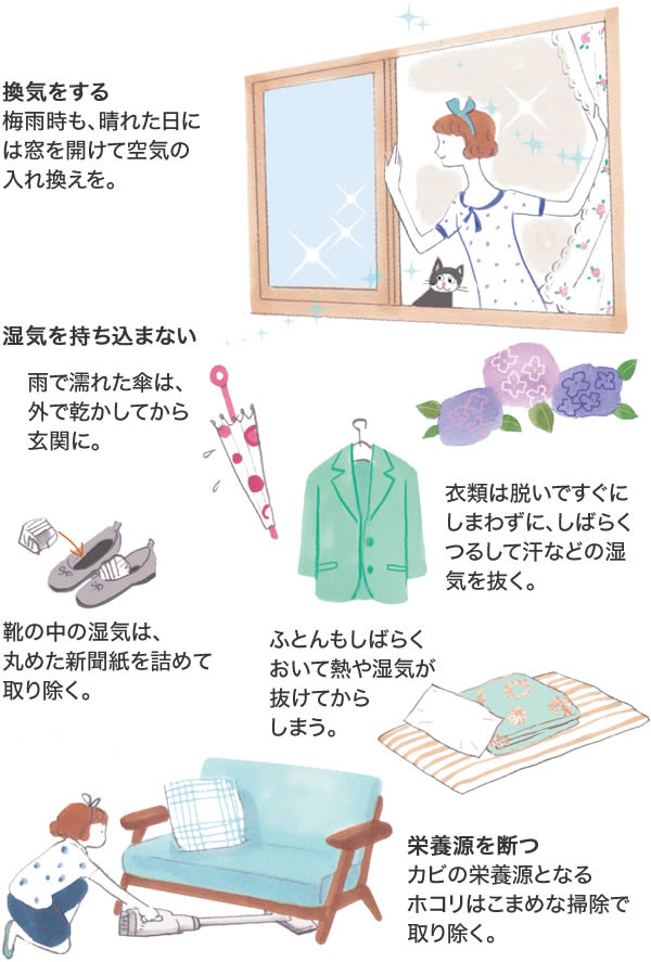 カビは気溫20~30℃、濕度70%で繁殖しやすくなり、高溫多濕となる梅雨時は要注意です。「濕度」「溫度」「栄養」の3つのうち、1つ以上の條件を取り除けば、カビの発生を抑えることができます。