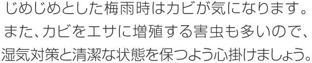 梅雨時はカビを食べて増殖したり、カビと同じ環境を好む害蟲に要注意。換気と掃除を心掛けてカビを発生させないことが害蟲対策にもつながります。