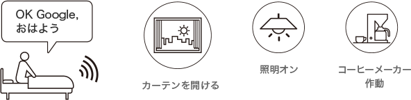 例えば、「OK Google, おはよう」の目覚めのひと聲で、カーテンが開き、照明がつき、キッチンからはコーヒーのいい香りがし、忙しい朝に時間のゆとりをもたらしてくれる…。また、家事で手が離せないときは、スマートスピーカーに聲を掛けるだけで、気象ニュースなど欲しい情報を得たり、照明の切り替えやテレビのオン?オフもできます。このように、わが家がもっと安らぐ場所になるように、暮らしのシーンに応じた操作が可能です。