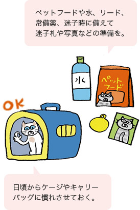 貓や犬を連れて避難できる避難場所や経路を事前に確認。環境の変化によるストレス行動や共同生活を想定して、備えておきましょう。