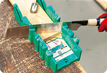 マイターボックスのガイドに刃を合わせれば、簡単に22.5度にカットできる。