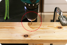 側板を上にし、ライン上の端から10mmのところに電動ドリルドライバーで下穴(ネジの長さの7割ぐらいの深さ)を開けるF。