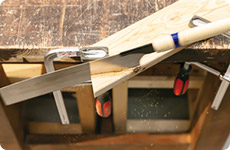 棚板の厚みの中央にラインがくるように接著。乾く前に、棚板の位置を調節し、しっかり圧著させる。