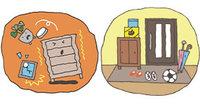物が散亂していると、ケガをしたり、ドアが開かないなど、逃げ遅れたりすることにもなりかねません。特に、避難通路になる廊下や脫出口となる玄関は、障害物を床に置かないこと。また、ドアの開閉をふさぐおそれのあるものは、片付けておきましょう。