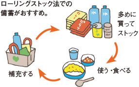 食料品や飲料水は最低でも3日分、できれば1週間分を備蓄。飲料水は調理用も含め1人1日3リットルあれば安心。