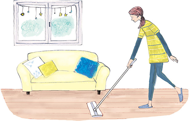 床がざらつくなど、汚れが目立ってきたら、掃除機をかけた後、水拭きをします。継ぎ目から水分が染み込むと腐食や反り、剝がれの原因になります。雑巾は固く絞り、水拭き後、から拭きをし、風通しをよくして十分に乾燥させます。