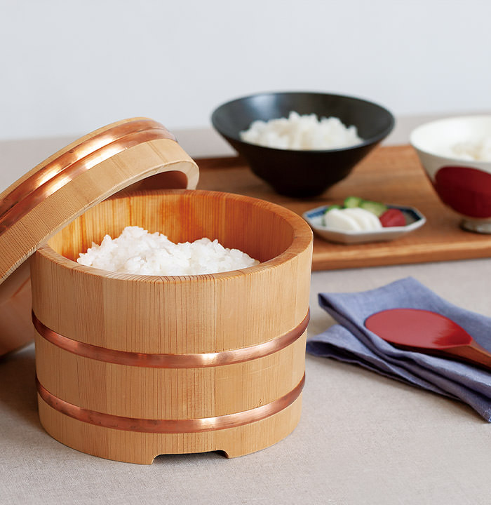 秋は新米の季節?昔ながらの道具を取り入れて?ごはんをもっとおいしく味わってみませんか?炊きたてのごはんを木製のおひつに移すと?粗熱を取りながら?ごはんに含まれる水分を適度に保って?もっちりとした食感に?ごはんは冷めると?一粒一粒噛みごたえが出て?米本來のうま味や甘みがより強く感じられます?また?ほんのりと木の香りが移るのも木製のおひつならでは?おひつはごはんを保存するだけでなく?よりおいしくしてくれる調理道具ともいえます?家族の?おかわり!?の聲に?食卓が笑顔であふれそう?