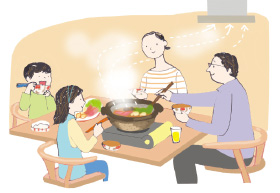 キッチンでの調理や、リビングで鍋物などを楽しむ場合は、加熱前から換気扇を回したり、窓を開けて、水蒸気を逃がす空気の流れをつくっておく。