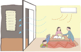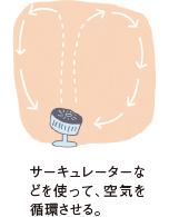 暖房使用時は、サーキュレーターや扇風機を利用して、暖かい空気を循環させ、冷たい空気を停滯させないようにします。また、家具は壁にぴったり付けずに2㎝以上離して、空気の通り道を確保しておきます。