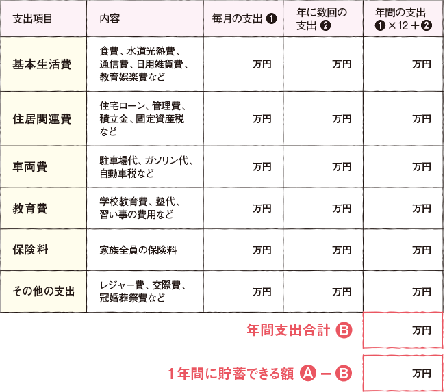 家計管理は、今のわが家の現(xiàn)狀を把握することから始めましょう。まず、1年間の収入と支出から、いくら貯蓄できているのか、もしくは赤字なのかを確認。毎月の家計簿をつけていても、年間で支払っている稅金や保険、また、ボーナスで支払っているものなどを見落としていることもあります。1年間の収支からわが家のお金の全體の流れを知ることで、毎月の生活費がどれぐらい必要かもわかります。