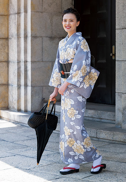 大ぶりの格子柄の帯、バッグやパラソルを黒で合わせてクールに引き締めました。バラの花をかたどった帯留めと鼻緒に赤を配し、大人の華やぎをプラス。帯は小ぶりのお太鼓結(jié)び、白の半襟と足袋を合わせ、きちんと著物風(fēng)に著付けています。観劇やレストランでのお食事にも出掛けられる著こなしです。